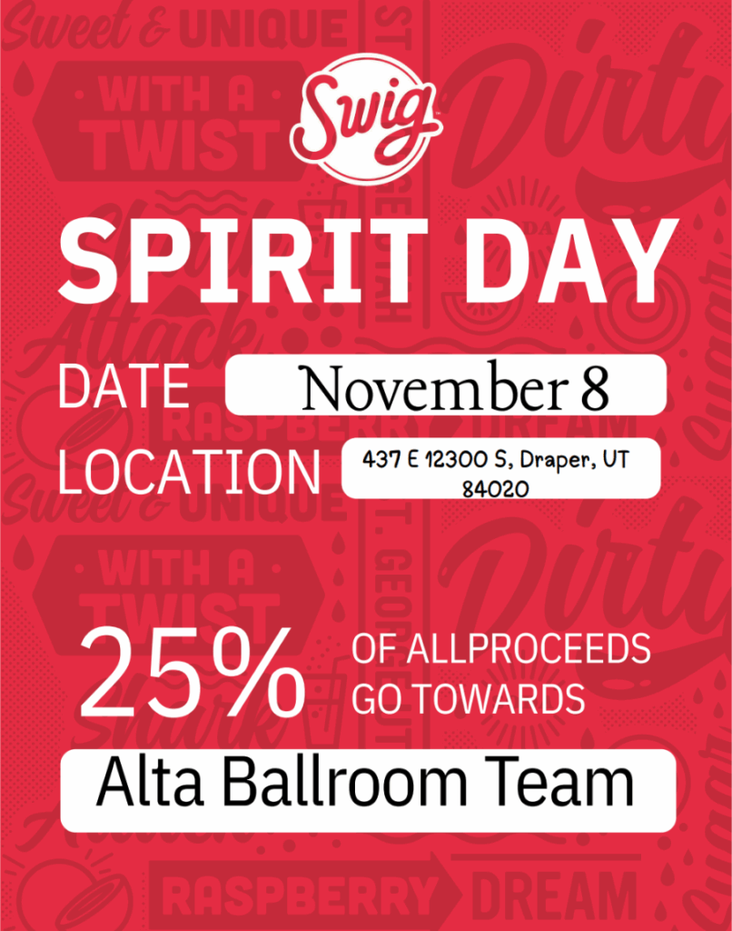 Come support the amazing Alta Ballroom Team on November 8 by stopping by SWIG! 25% of all proceeds for the night will to go the Ballroom Team. Be sure to