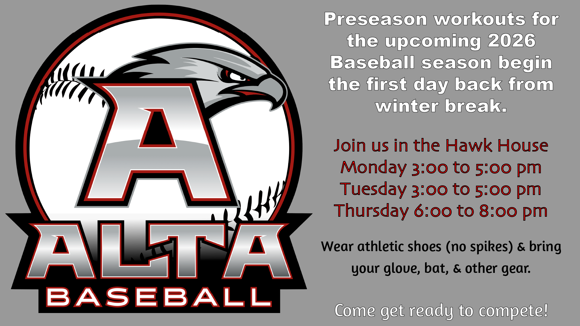 If you plan to try out for Baseball in the Spring you’ll have an opportunity to start preparation the first day we return from winter break. Beginning Januray 5th Baseball