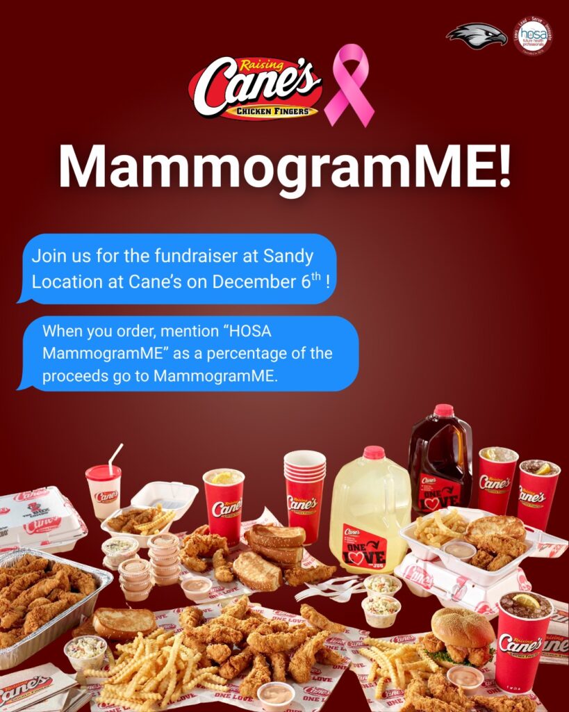 Come support breast cancer awareness by coming to the Raising Cane’s Sandy location this Saturday (12/06/2025) between 5 and 9 PM. Make sure to mention Mammogram Me HOSA at checkout