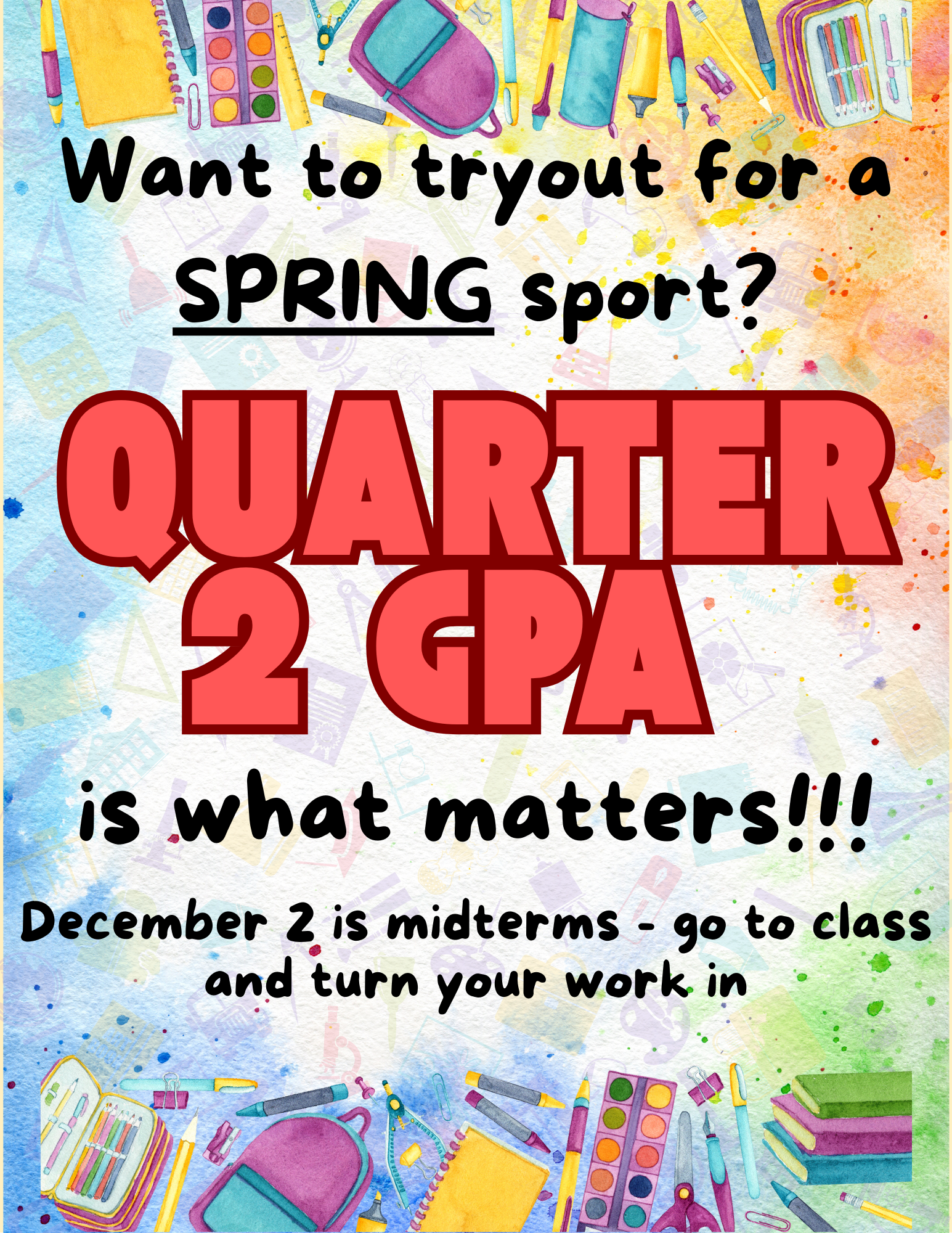 Remember that Q2 grades are what qualify you for Spring Sports tryouts!
