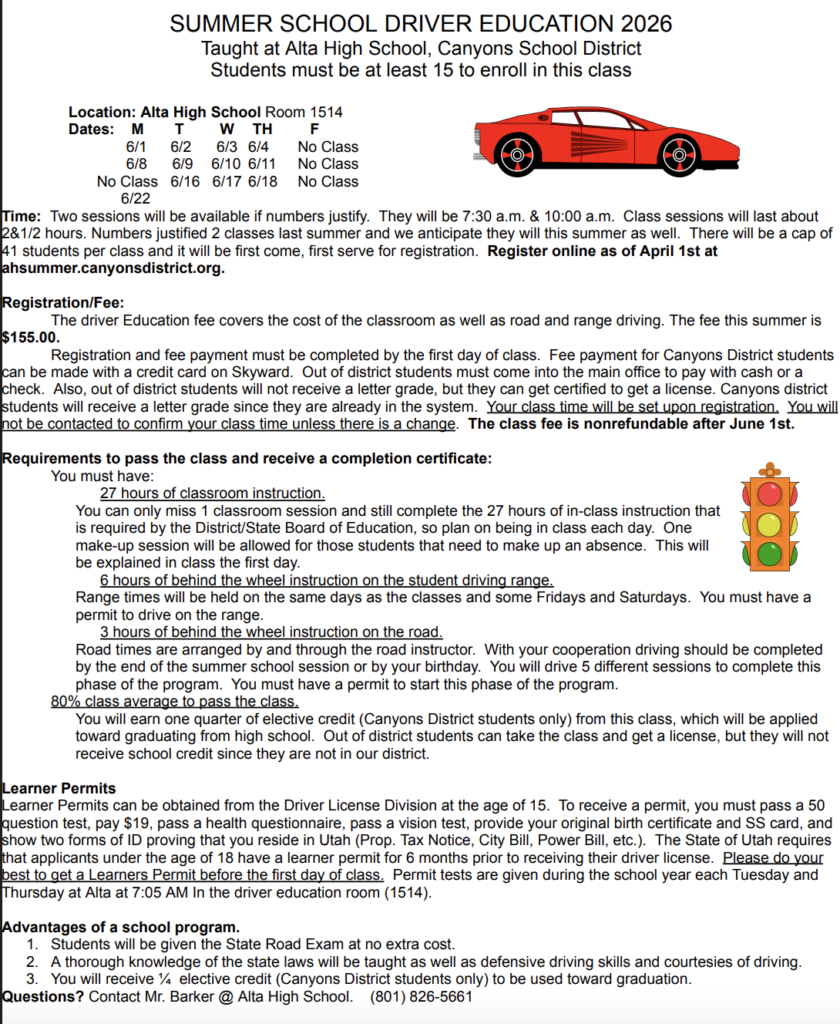 Alta High School offers various options for summer courses. Registration begins on April 1, 2026 at ahsummer.canyonsdistrict.org. You will need to login with your current Skyward login and password to access the site. From there, you can choose the class that works with your schedule.