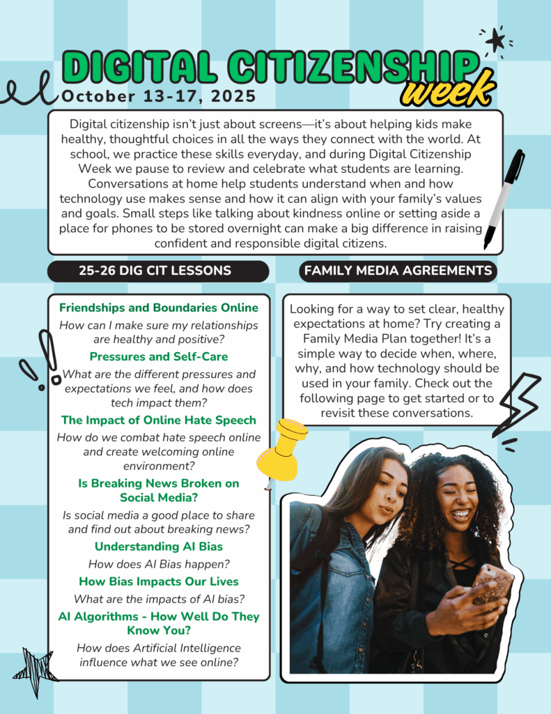 Canyons School District recognizes the importance and wants to celebrate Digital Citizenship for students of all ages as they navigate this increasingly digital world! To highlight this essential skill set, Digital Citizenship Week will take place October 13-17, 2025. This year, students will be engaging in activities and discussions that empower students to seek balance in their technology use and be aware of their online actions. Connect with us throughout the week!
