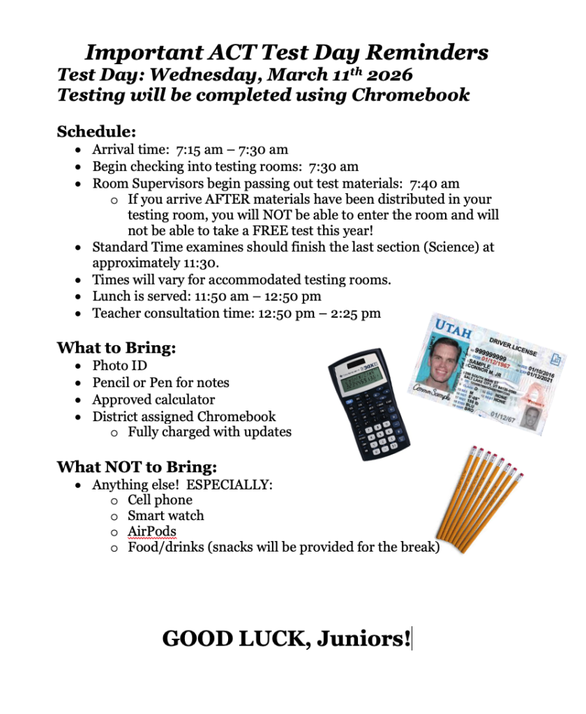 On Wednesday, March 11th, 2026, all 11th grade students in the Canyons School District have the opportunity to take the ACT for free as part of the district’s college readiness focus. Alta 11th grade students are already registered for the ACT, which is used by many colleges and universities as part of their admission requirements, scholarship opportunities, and for NCAA eligibility. It is also a strong predictor of college success.