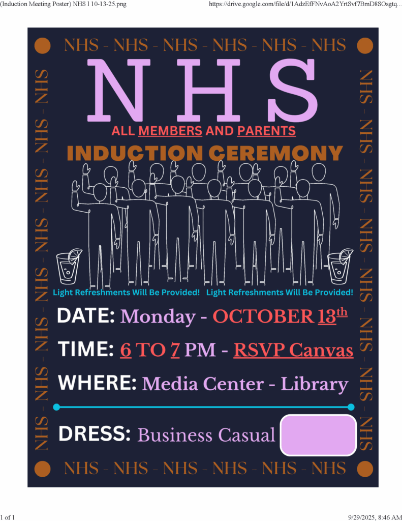 All current members, new members and their parents are invited. Refreshments will be provided. Come welcome and support our newest NHS members.