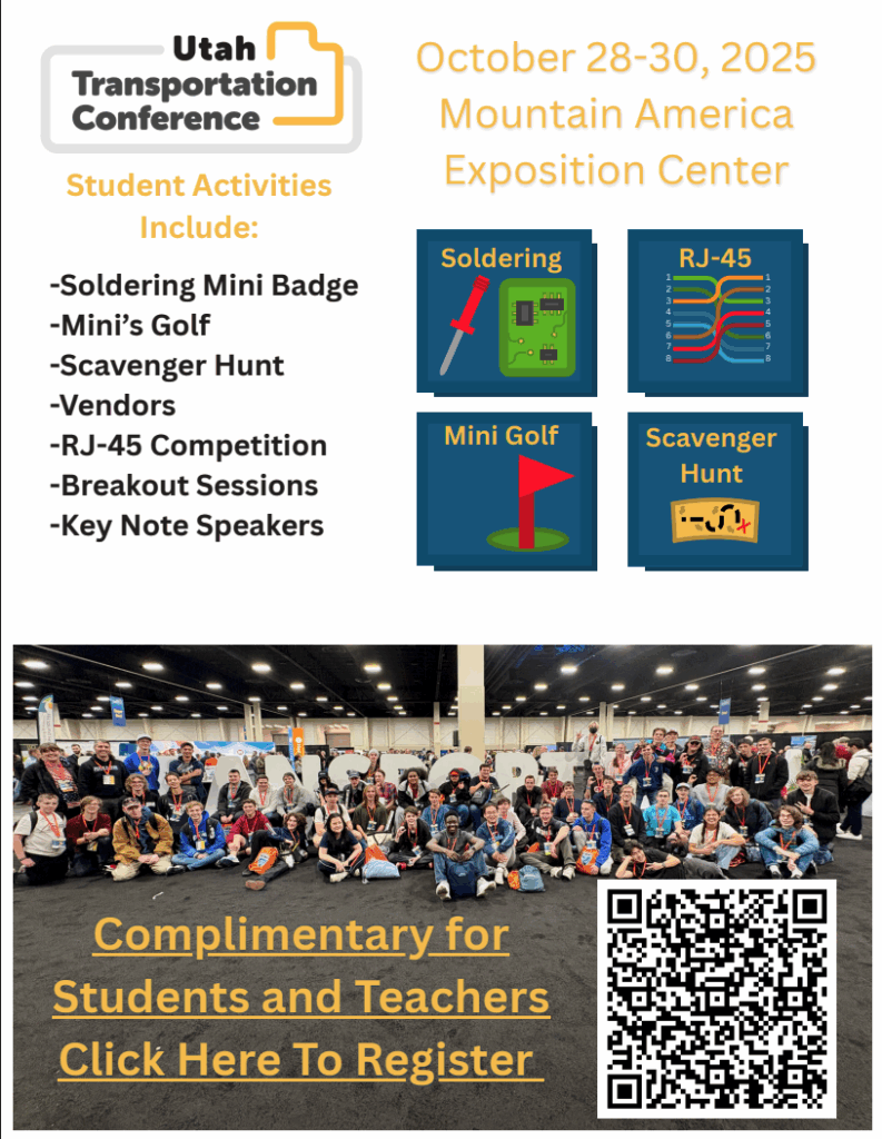 If you’re interested in transportation, the Utah Department of Transportation has invited students to attend their annual UDOT conference on October 29th from 9am – 1pm. Activities include soldering, crimping, a scavenger hunt, and Lego bridge building, as well as presentations from professionals! Email lyndsey.nelson@canyonsdistrict.org to RSVP for this field trip!