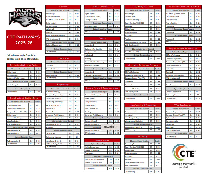 Alta High School offers several of the CTE Pathways that can be completed at our school. Click on each link below to view the classes necessary to complete that Pathway.